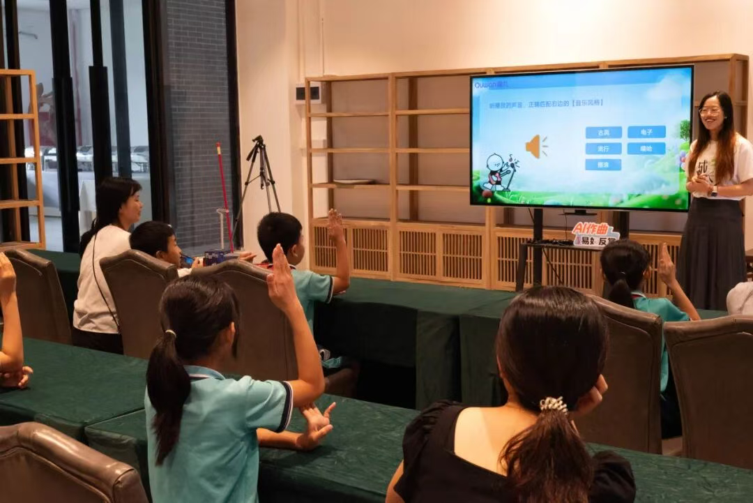 5月25日,由中国教育学会青少年媒介素养分会、广州市未成年人网络生态治理基地、广州市教育学会等单位组织的“e起成长教育行活动”在从化罗洞工匠小镇成功举办。活动中,趣丸科技的公益老师为同学们准备了一堂特殊的AI音乐课。在课堂上,同学们在AI音乐应用的帮助下认识了不同的音乐曲风,学习了如何获取音乐创作的灵感,并在老师的引导下使用天谱乐AI进行音乐创作。