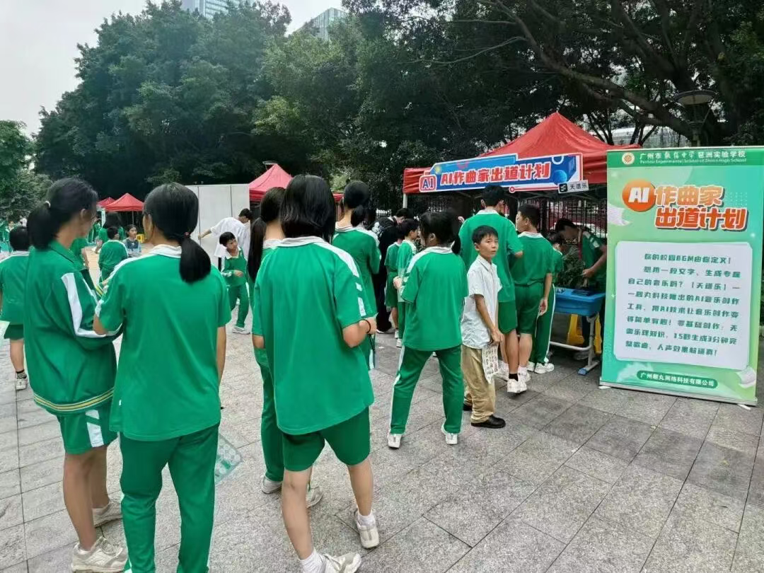 5月25日,由中国教育学会青少年媒介素养分会、广州市未成年人网络生态治理基地、广州市教育学会等单位组织的“e起成长教育行活动”在从化罗洞工匠小镇成功举办。活动中,趣丸科技的公益老师为同学们准备了一堂特殊的AI音乐课。在课堂上,同学们在AI音乐应用的帮助下认识了不同的音乐曲风,学习了如何获取音乐创作的灵感,并在老师的引导下使用天谱乐AI进行音乐创作。